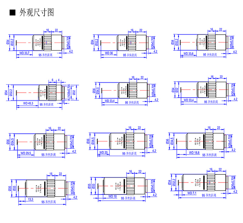 長工作距離平場復消色差APO金相物鏡2X 5X 10X 20X 50X 100X 無限遠校正,焦距=200mm,齊焦距離95mm